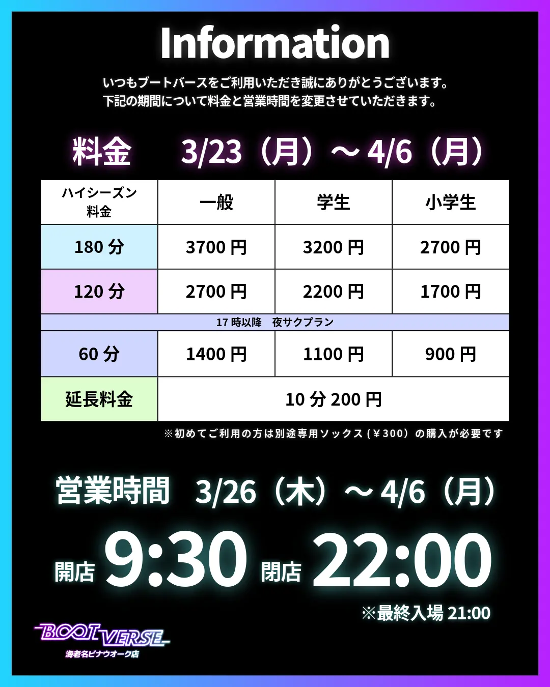 (専用ソックスをお忘れの場合は再購入が必要です) - ご利用時間を超過すると、10分の自動延長となりますのでご了承ください