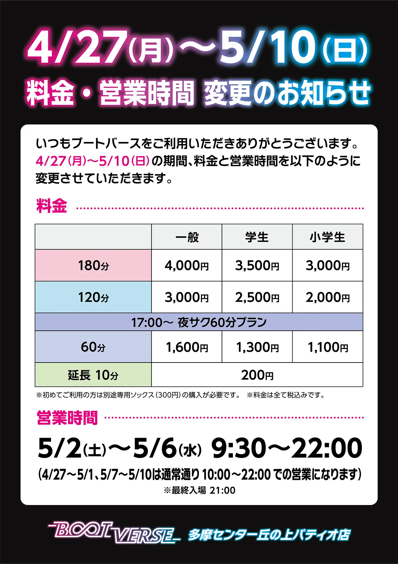 (専用ソックスをお忘れの場合は再購入が必要です) - ご利用時間を超過すると、10分の自動延長となりますのでご了承ください