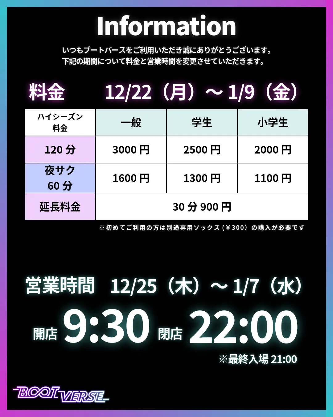 (専用ソックスをお忘れの場合は再購入が必要です) - ご利用時間を超過すると、30分の自動延長となりますのでご了承ください