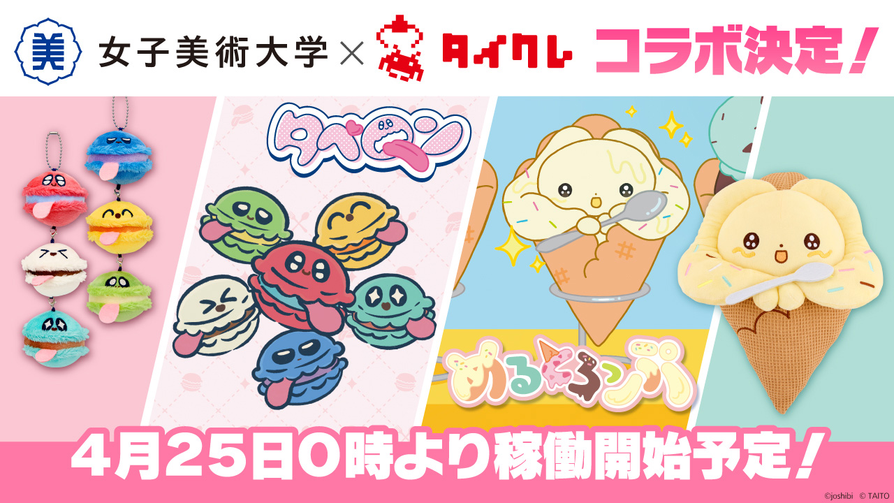 女子美術大学との産学連携企画として、オリジナルキャラクターの共同開発・プライズ化を行いました。現役学生ならではの自由な発想から誕生したキャラクター「めるとろっぷ」と「タベロン」は、おうちでクレーンゲームが楽しめる「タイトーオンラインクレーン」にて4月25日(金)0時より限定プライズとして展開いたします。