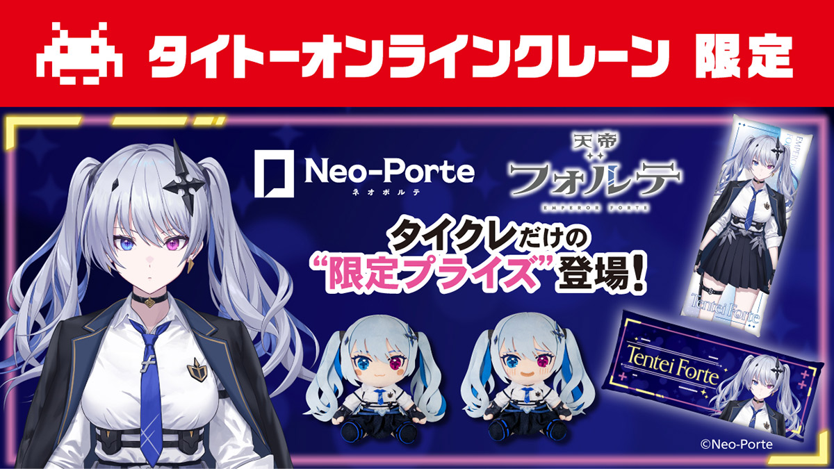 いつでもどこでもクレーンゲームが楽しめるタイトーオンラインクレーン(タイクレ)は、株式会社Neo-Porteが運営するバーチャルライバーグループ「Neo-Porte」の幅広いゲーム配信や、歌ってみたや雑談などの配信で人気を誇る天帝フォルテさんとコラボレーションし、天帝フォルテさんのプライズを11月29日(金)21:00よりタイクレ限定で展開を開始いたします。