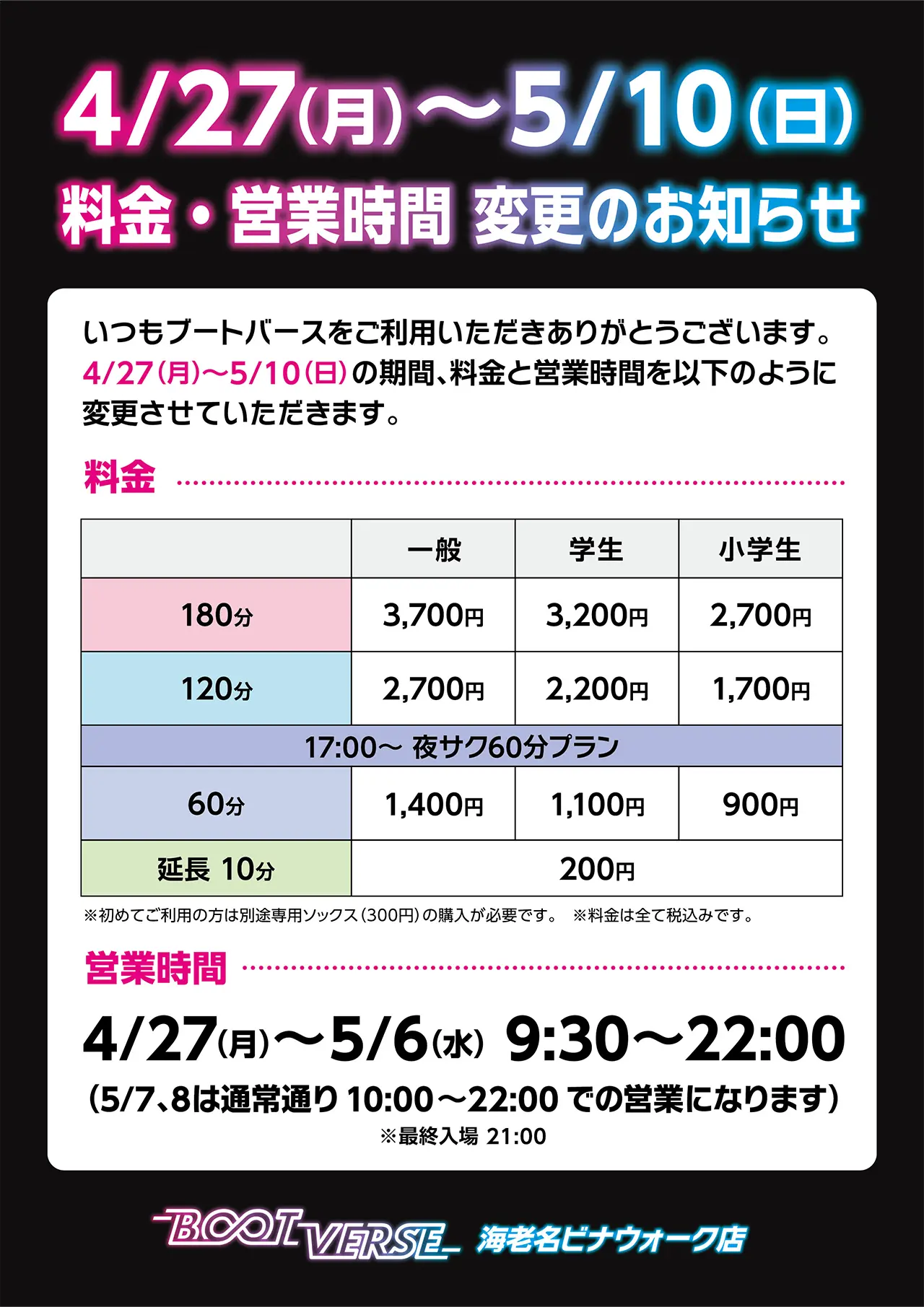 (専用ソックスをお忘れの場合は再購入が必要です) - ご利用時間を超過すると、10分の自動延長となりますのでご了承ください
