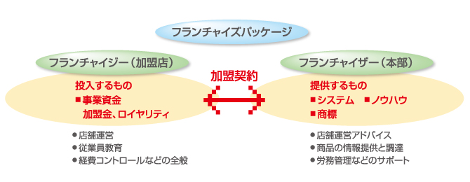 フランチャイズパッケージではフランチャイジー(加盟店)とフランチャイザー(本部)が加盟契約を結ぶことによってフランチャイザーからシステムやノウハウの提供から店舗運営のアドバイスまで、様々なサポートを提供いたします。