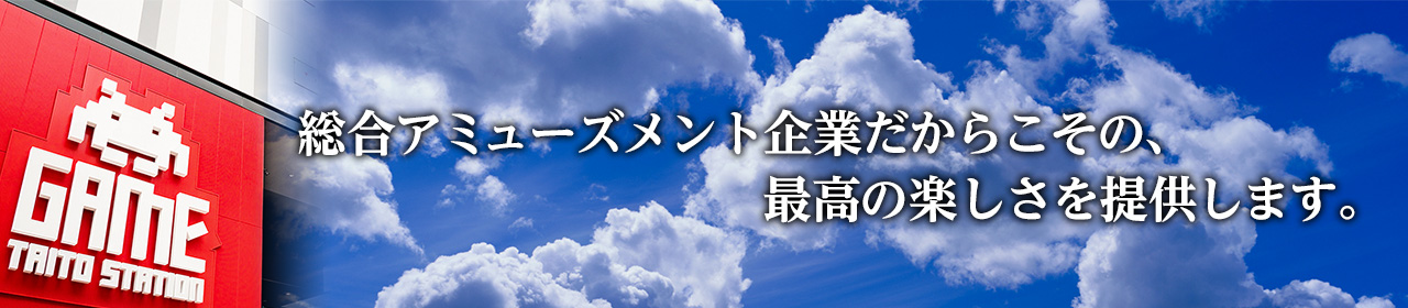 全国に展開するアミューズメント施設や、そこで欠かせないアーケードゲーム機、キャラクターグッズや玩具などのプライズ(景品)、そしていつでも仲間とつながれるモバイルゲームといった、幅広い事業の展開と各事業の連携により、タイトーは最高のサービス、商品、コンテンツを提供しております。そこで培われた高い信頼性と熱いご支持こそが、私たちのブランド力。