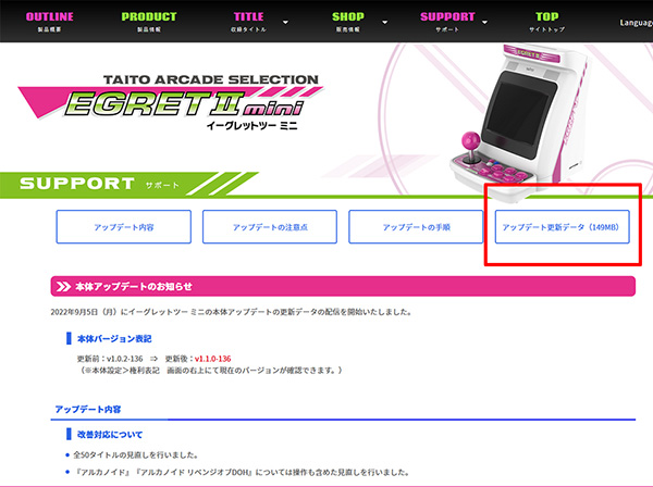 なお弊社製品・サービスでご不明な点やトラブルが発生した場合は、チャットサポートより「物販(電車でGO!PLUG&PLAY・グルーヴコースターワイヤレスホン等)>EGRETⅡmini>【EGRETⅡmini】仕様について>【EGRETⅡmini】アップデート」にてお問合せください。