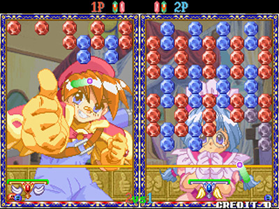 自機を移動して、下がってくるストーンにボールを当てたり、ちぎったりして消していきます。床にボールが当たるとストーンが下がってラインを超えるとゲーム終了です。