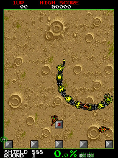 自機を操作してレーザーカッターでフィールドを80%以上切り落とせばクリアです。ラインを引く間バリアがOFFになり、このとき敵がラインに触れるとミスになります。