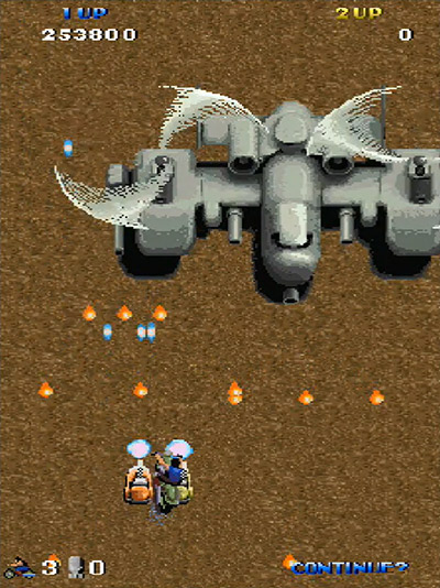 戦闘ヘリ「バトル・タイガー」を操作して敵を撃破します。武器選択アイテムは「赤:前方/緑:一直線/青:扇状/黄:左右上下」のショットに変化します。