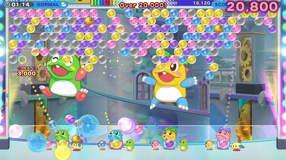 In this mode, players try to erase the bubble-encapsulated invaders by sticking three or more bubbles of the same color together.