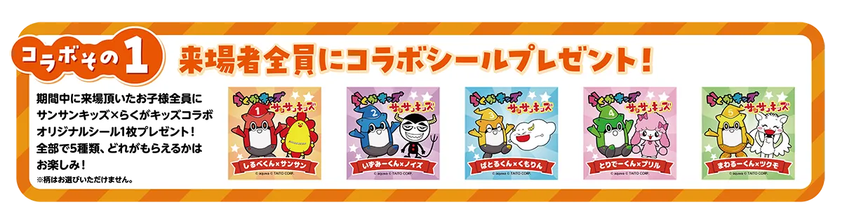 期間中に来場頂いたお子様全員にサンサンキッズ×らくがキッズコラボオリジナルシール1枚プレゼント!