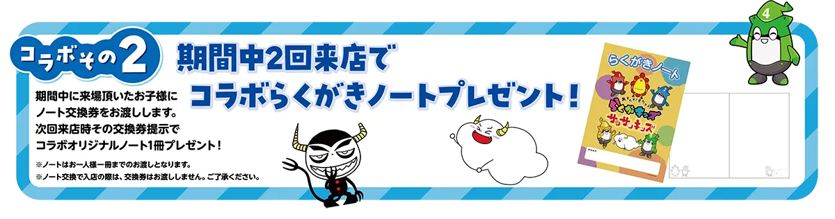 「期間中2回来店でコラボらくがきノートプレゼント!」