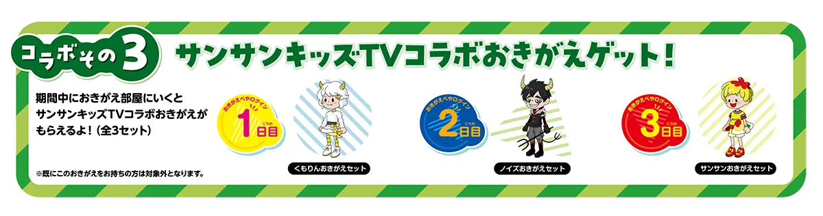 期間中におきがえ部屋にいくとサンサンキッズTVコラボおきがえがもらえるよ!(全3セット)