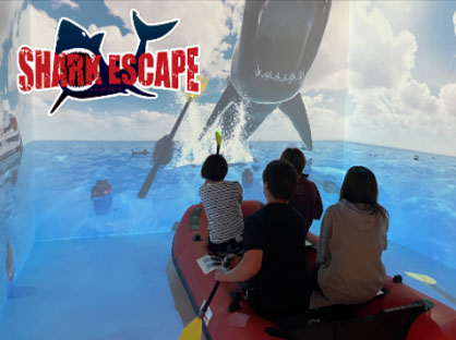 前左右+床を覆う4D映像システムで海上サバイバル体験。360度から襲い来る人食いザメを撃退し、脱出を目指します。実物の救助ボートに乗り込み、オール型デバイスを漕いでプレイ! 君は生き残れるか!?