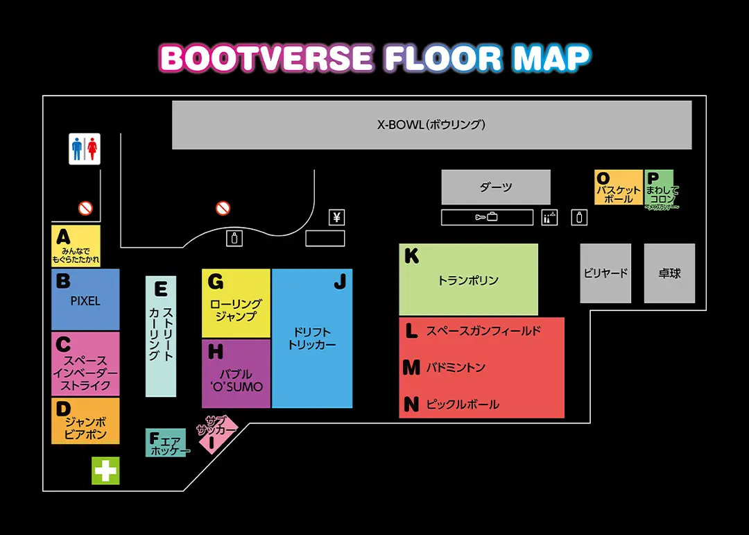 BOOTVERSEの人気アトラクション「PIXEL(ピクセル)」「スペースインベーダーストライク」「ローリングジャンプ」「ドリフトトリッカー」をはじめ初導入の新アトラクションから、最新の体感インディーゲームまで16種類の様々な“パーティースポーツ”が遊び放題!