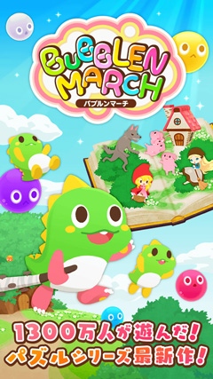 「バブルンマーチ」は、1994年にアーケードゲームとして登場し、以降家庭用ゲーム機やスマートフォン向けゲームで大ヒットとなった「パズルボブル」のシリーズ最新作です。魔法使いの呪いによってドラゴンに変えられてしまった兄弟“バブルン”と“ボブルン”が、ちょっと不思議なおとぎの世界「赤ずきん」や「シンデレラ」などを舞台に冒険を進める、パズルアドベンチャーゲームです。フリックして縦、横にバブルをスライドさせて3色のバブルを揃えるだけのシンプルなルールのパズルに、様々なクリア条件のステージを組み合わせることで、手軽ながら遊び応えのあるパズルゲームとなっています。