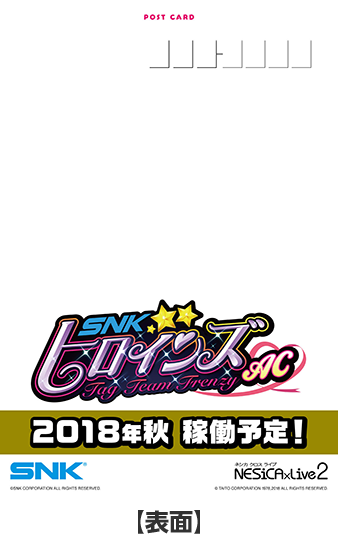 ロケーションテストにご参加いただいた方には「SNKヒロインズ Tag Team Frenzy AC」オリジナルデザインの特製ポストカードをプレゼントいたします。