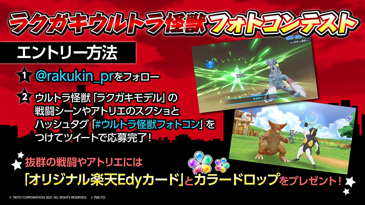 「ウルトラ怪獣」のラクガキモデルの戦闘シーン、またはアトリエ配置のスクショでTwitterへ投稿。ラクガキモデルやスキル演出、背景の組み合わせが秀逸なシーンを撮影した作品は「オリジナルEdyカード」にしてプレゼント!