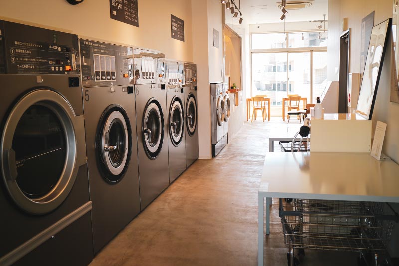 明るく清潔感のあるフロアには、ランドリー機器は勿論のこと、サービスコンセントやwi-fi環境完備のレストスペースも充実。カフェも併設されており、パンやコーヒー、地ビールも楽しめます。