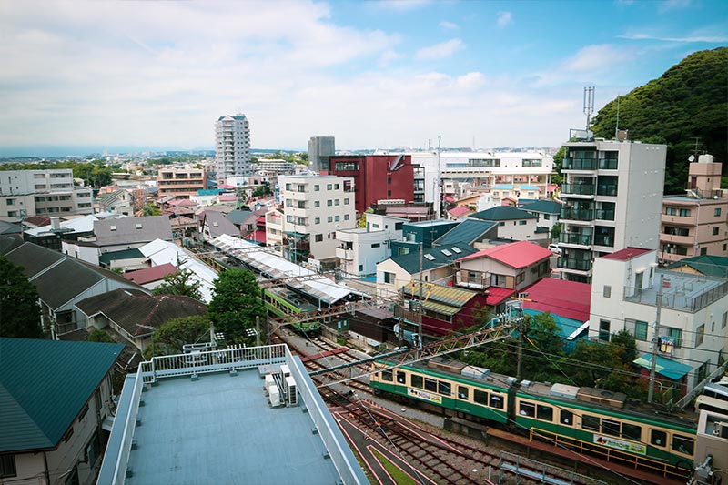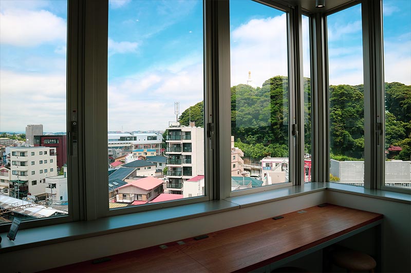 北西方面の窓は、江ノ電江ノ島駅が見下せる絶好の撮影ポイント。